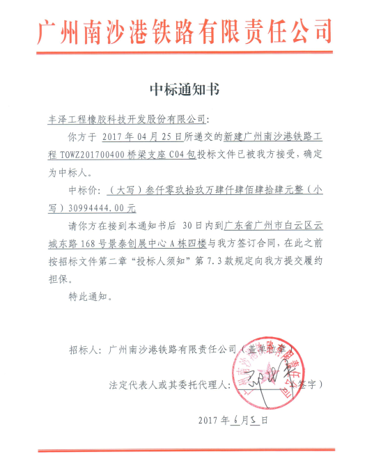 6月5日,丰泽股份中标新建广州南沙港铁路工程TOWZ201700400桥梁支座C04包件,中标价30994444.00元。