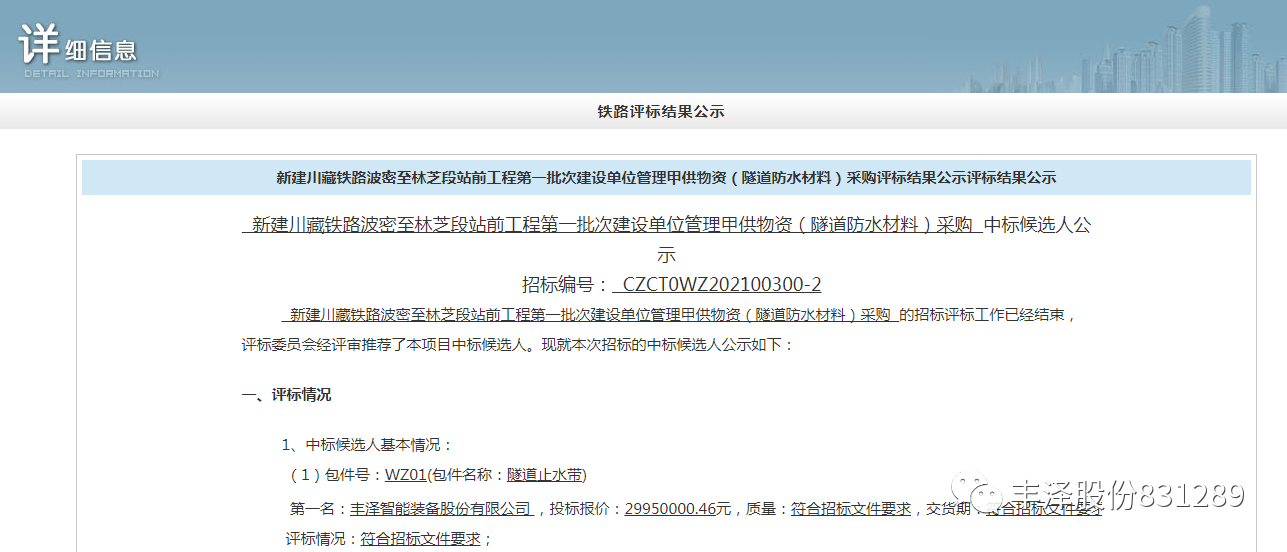 2021年8月30日川藏铁路有限公司公示了“川藏铁路有限公司雅安至林芝段工程甲供物资(止水带产品)”中标结果。丰泽股份凭借过硬的产品质量,优秀的售后服务,良好的企业信誉,以绝对的优势脱颖而出,顺利中标,中标金额29950000.46元。