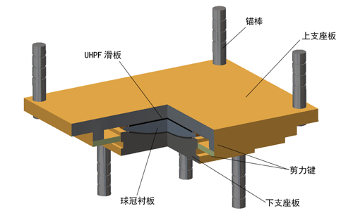 分级减震球型钢支座是在普通球型钢支座和盆式橡胶支座的基础上做了改进和创新,通过在上支座板设置两层剪力键装置实现分级保护功能,正常作用下剪力键不剪断,满足静力设计需求;地震作用下一级剪力键被剪断,上支座板自由滑动实现隔震功能:滑动到设计位移后二级剪力键限制支座继续滑动起到限位防落梁的功能;采用超高性能聚四氟乙烯(UHPF)作为滑板材料,解决了支座服役期滑板耐久性差的技术难题。